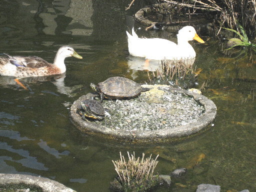 亀たちが日向ぼっこしている横をアヒルたちが泳いでいます♪ 以前から不思議なのですが、亀は人が近付くと一目散に逃げます。アヒルは無害とわかっているのでしょうか。それとも人知れず会話しているのでしょうか・・・。 |