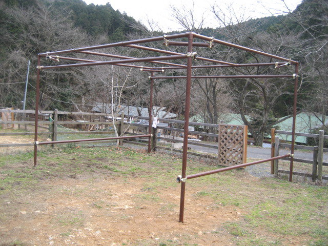 試行錯誤を繰り返し、とりあえず農園オートサイトに設置する屋根の骨組みが完成しました。単管パイプですが、できるだけ見た目がカッコよくなるように作ったつもりです。屋根の取り付けが楽しみです♪ |