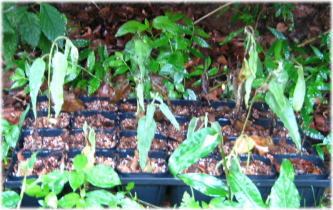 レモンユーカリの挿し木してから約1ヶ月が経過。やはりそんなにあまい世界ではなさそうです。残ったのはたった約5分の1程度。まだまだ研究が必要です。敗因はちょっとビビり過ぎて、日陰に置いておく期間が長くなってしまったためと思われます。 |