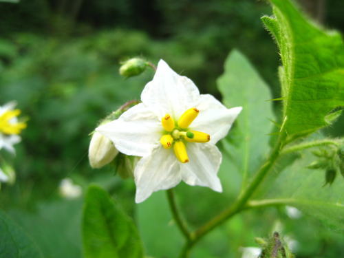 この花、おしべがバナナのようです。なすの花にとっても良く似ています。気になるので調べます・・・。あっ!見つけました!この花は「ワルナスビ」と言うそうです。やっぱりナス科だったんですね。 「よく繁殖し、除草剤も効きにくく、一度生えると駆除しにくい。すきこむと、地下茎の切れ端一つ一つから芽が出て以前より増えてしまう始末の悪さである。和名の「ワルナスビ」は、このような性質により付けられた。」(ウィキペディアより)