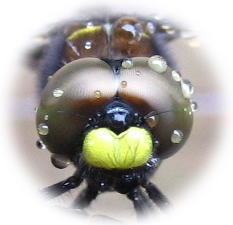 コシアキトンボの顔面アップです。雨の後で水滴がついていますね。先日、僕の大好きなTV番組"すべらない話"でトンボの顔がもげるという話がありましたが、もげたのはこんな顔です。怖すぎます・・・。