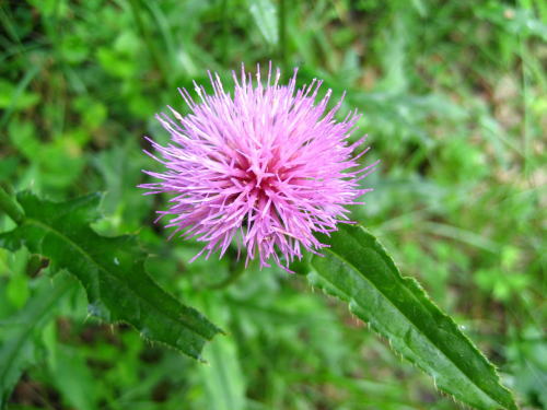 画像はアザミ。チアガールが持っているポンポンのような花を咲かせます。今は時期が遅いですが若芽、若い茎が食用になります。くせがなくおいしいらしいです。 |