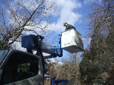 ティピーサイト奥にあるフジ蔓がコナラに絡んで、絡まれたコナラの枝が腐った状態になっていました。剪定するにもハシゴで上れるような低い位置にはなく、高所作業車を使っての本格的な剪定作業となりました。地上から約10m。眺めも最高でしたが、正直、怖かったです(>_<)緊張のあまり肩がものすごくこってしまいました。 |