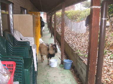 廊下に待機中のルー。何故待機しているかと言いますと、小屋の扉に頭突きを繰り返し、とうとう破壊、その扉の修理待ちです。本人は何事もなかったかのような表情をしています。「メ〜・・・」 |