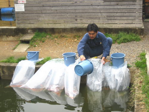 今年も小さな鯉を釣堀池に放流しました。放流したての鯉は警戒心が少ないので良く釣れますヨ。 毎年やっているせいか少し様になって来ている感じがします。目指せ鯉職人。