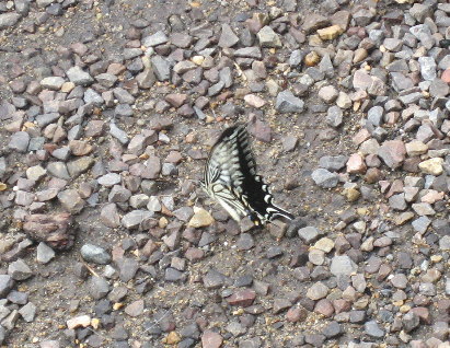 アゲハ蝶が何度も地面に降りてきて、何かを吸っていました。去った後を見ても何もなかったのですが、近頃、暑いので喉が乾いて水滴でも飲んでいたのでしょうか・・・ |