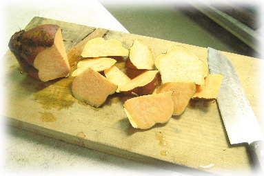 『ルーにも少しお裾分け〜』と思って安納芋をカットしてビックリ!生の状態でも中身が柿色なんですね☆ |