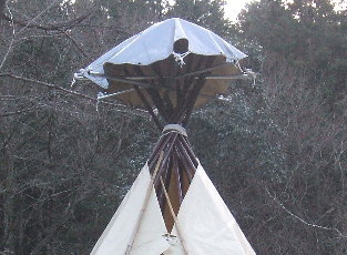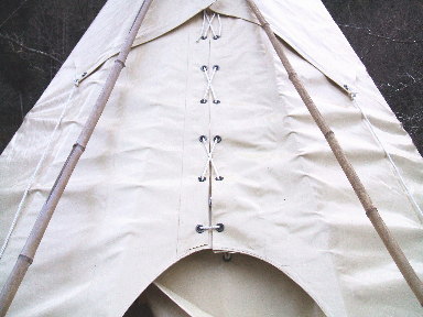 新生ティピーのこだわりの1つが正面のつなぎめ。本来は棒で編み込むように刺してつなげていくのですが、大雨の時はどうしても刺したところから多少雨漏れしてしまいます。そこで生地を重ね合わせて靴紐を結ぶ要領でつなげていくことにしました。これで大雨の時でも安心です(^-^) |