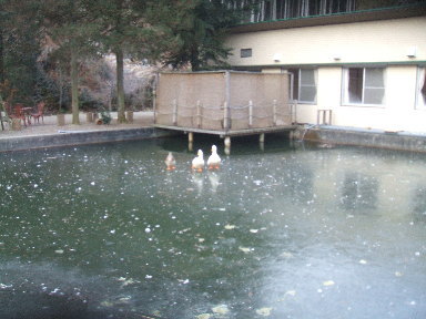 正しく言うと、その様に見えるのです。池が凍ってその上を歩くあひる達・・・。何とも滑稽な冬景色です(^-^) |