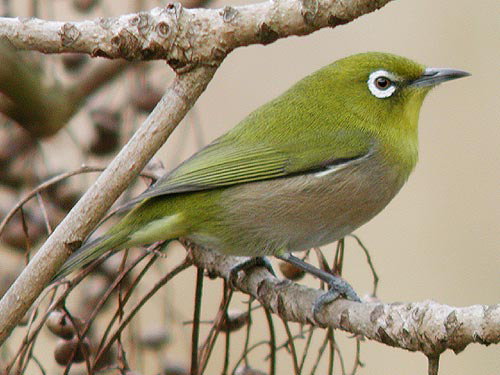 黄緑色をしており、目の周りが白い特徴があります。 冬は庭木にも良く見られます。梅の花の蜜が大好物。