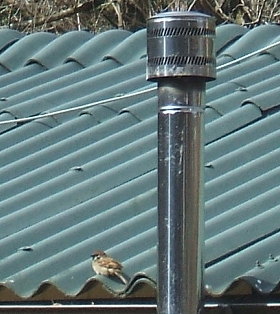 最近毎朝のように見かけるのですが、スズメが薪ストーブの煙突に何度も突進してコンッコンッ!と音をたてて遊んでいます。もしからしたら、煙突に移るイビツな形の自分自身に攻撃しているのかも知れません。ほんとに毎朝飽きずにやっています。 |