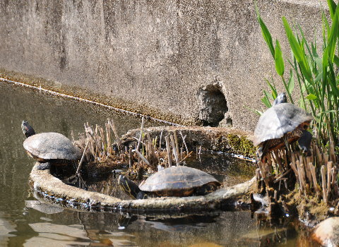 こちらの3匹はいっしょによく日向ぼっこをしています。喧嘩はしませんが、仲良しかどうかもわかりません・・・。お互いのプライバシーは常に保っている様子です。 |