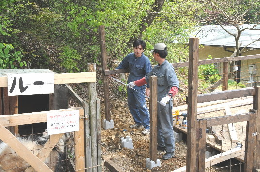 クマの新居。いよいよ大詰めです☆明日、明後日中には完成します! ルーが羨ましそうに見ていますが、ルーの小屋もリニューアルする予定ですのでご安心下さい(^-^) |