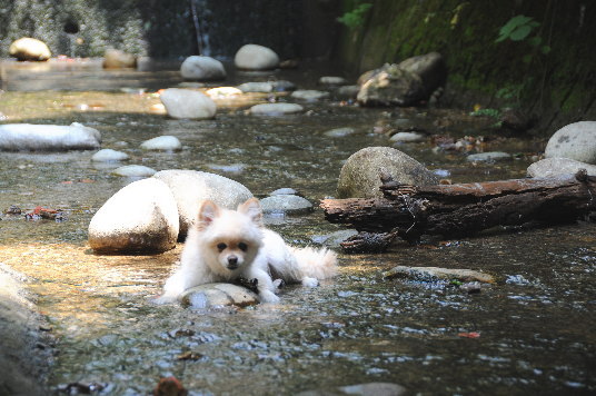 優子社長の秘書を務める秘書犬フーちゃん。たま〜にクマの様子をうかがいに犬キャンにやってきます。先日来た時はせせらぎサイトの川に御腹を浸けて休んでいました。とっても気持ち良さげです♪ |