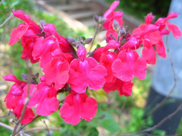 「チェリーセージ」農園オートサイトの南斜面に咲いています。この花はとにかく花期が長い!春から秋まで花が見れます。大変お得な花なのです(^-^) |