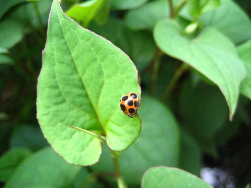 テントウ虫。好きな昆虫の1つです。小学生の頃、猛烈にハマってポケットをテントウ虫だらけにして歩いていたこともあります。ポケットの中にはナナホシやナミテントウはもちろん、ジュウニヤホシテントウ、カメノコテントウ、キイロテントウなんかも入っていました。画像は「トホシテントウ」。地元ではあまり見なかった種類です。未だにこういうテントウ虫を見つけるとほのかにテンションが上がる傾向があります。 |