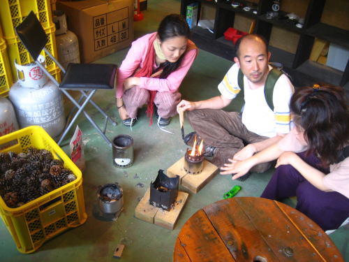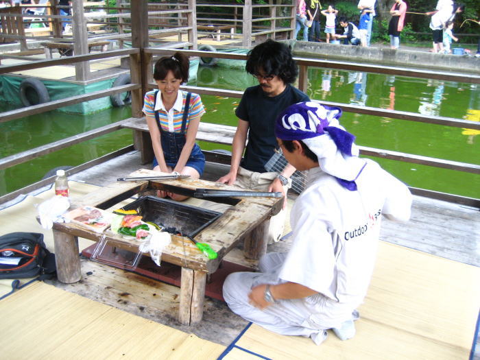 じゃらんにて水上デッキが紹介されます。本日はその取材でした。キレイなモデルさんを前に緊張気味のケッチ。少しぎこちない手つきで火熾ししておりました。