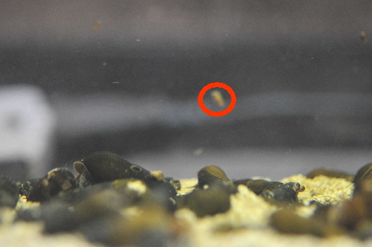 蛍のエサとして養殖しているカワニナですが、今年は順調です☆死んでしまうものもほとんどなく、稚貝(赤丸部分)をどんどん生んで繁殖しています。おかげで蛍の幼虫も順調に成長しています。放流の日が楽しみです(^-^) |
