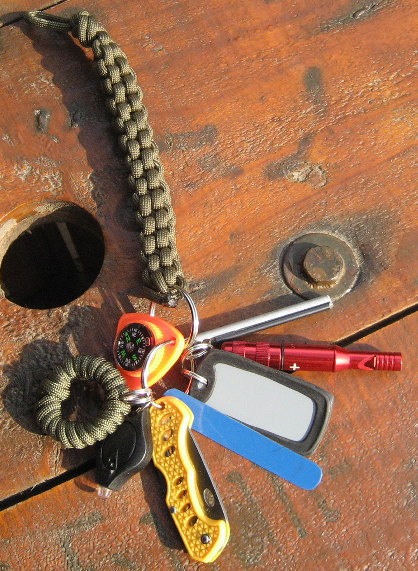 ん?何だコレは?? 編み込まれたパラシュートコードの先端にコンパス、ミラー、ファイヤースターター、ワイヤーソー、ナイフ、ライト、ホイッスル、IDケース・・・近日発売!! |