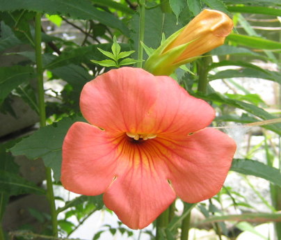 今年初めて咲きました。調べたところノウゼンカズラのようです。通常は夏に咲く花でもっとたくさん花をつける見たいです。花が咲くまでただの雑草だと思っていましたf(^^;) |