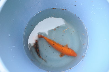 バケツの中の鯉です。釣掘の様子を見ているとよく釣れる方となかなか釣れない方がおられます。僕も釣りは得意な方ではないのでどんな違いがあるのかはわからないのですが、釣りにはセンスといったものが存在するようです。