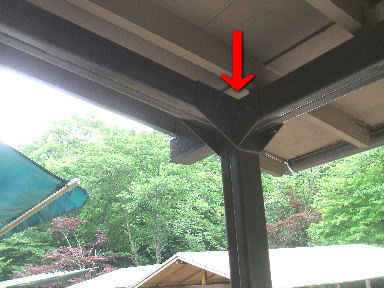 受付前、売店横の屋根の上、↓部分にスズメが地味〜に巣を作っています。餌をせっせと運ぶ親スズメに癒されてます(^-^) |