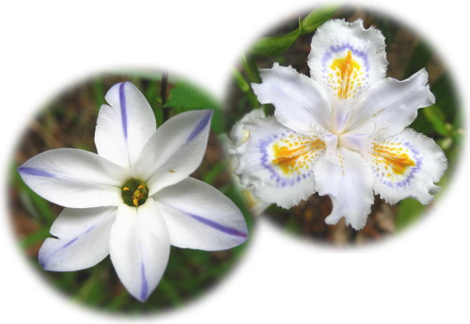 画像は場内で発見した綺麗で不思議な花たちです。右はしゃがの花、左はよくわかりませんがとても興味深い模様をしています。 |