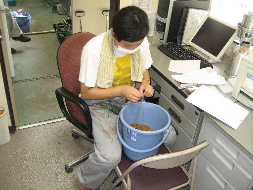 スタッフなおちゃんが何やら袋に詰めています・・・かなり怪しげです・・・。実はこれ、フライトラップのオリジナルベイトを袋に小分けしているのです。マスクをしているのはクシャミ避けです。決して毒物は入っていないのですが、なおちゃんはマスクをしないとクシャミが出てしまうのです。それにしても怪しい光景です。