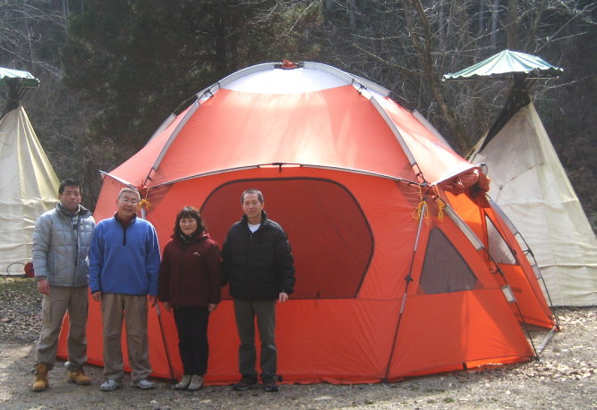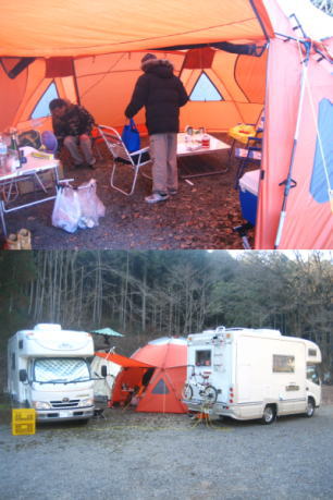 φ6mの特大シェルターを設営してキャンプを楽しむお客様を発見!!キャンピングカーも横付けして大宴会場と化していました。高さは背丈の約2倍。これだけ大きなシェルターがあれば雨の日もヘッチャラですね(^-^) |