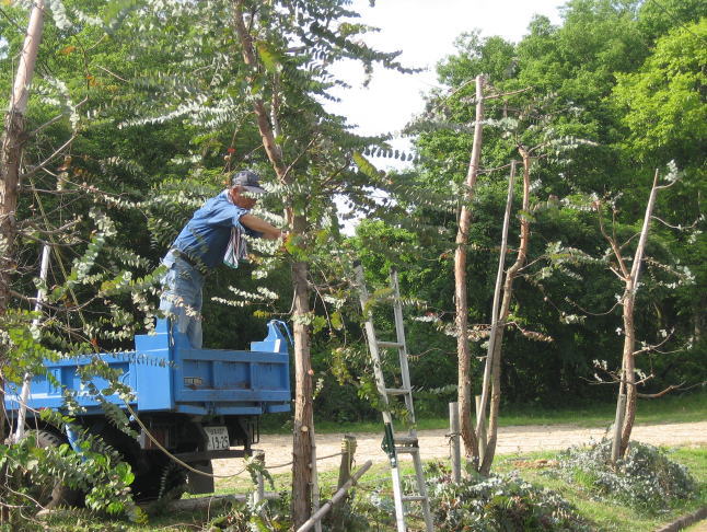 ユーカリを剪定中のスタッフ安藤さん。のどかな景色に何だか癒されます。周囲がユーカリの香りで包まれておりました♪