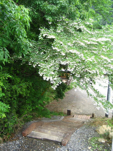 オートサイト階段にエゴの木がきれいな花のアーチを作っています。この時期のほんの間しかくぐることのできないアーチです。くぐったあなたにはいいことが訪れるかも??☆ |