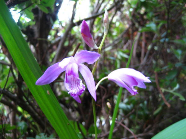 和室横の斜面に小さく咲く紫蘭(シラン)です。花の名前を聞かれても僕はシラン・・・って答えます。