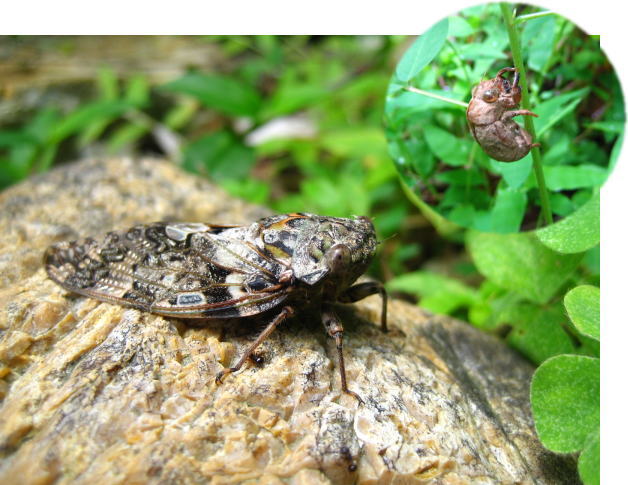 じっとしているヒグラシを発見。ここぞとばかりに写真を撮りまくりました。近くに小さな抜け殻があったので、こいつから抜け出て来たところだったのかも知れません。 |