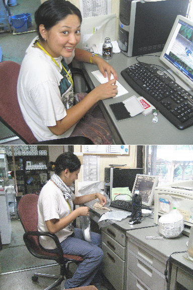 シーズン中はお客様の対応が迅速にできるよう受付にいることが多いです。その間に地味〜に行われている作業が「内職」。紙皿、おはしセットを作ったり、アミを開封したり、領収書の印鑑を押したり、フライトラップのベイトやあひるのエサを袋に詰めたりetc...泣けるほど地味な作業を笑顔でこなすなおちゃんです。 |