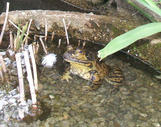 アヒル小屋を掃除していると、カエルの置物を発見・・・と思ったら本物のカエルでした・・・全く動きません。至近距離からフラッシュをたいても全く動きません。 |