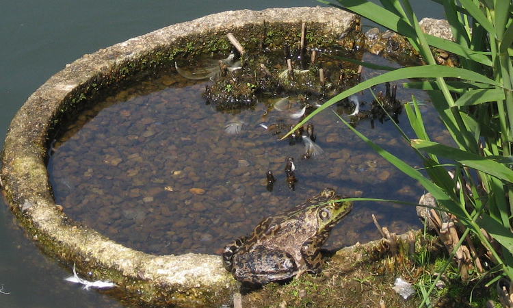 草魚池の隠れキャラ「ウシガエル」。いつもどこに潜んでいるのでしょうか。突如、姿を現します。食用ガエルですが、食べて見たいとは全く思いません。