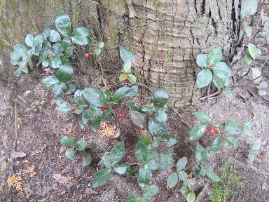 こもれびサイトにて。ヒノキの下に生えているのはヒノキの赤ちゃんではありません。ヤブコウジです。決まってヒノキの下にはこのヤブコウジが生えています。ジンベイザメに付くコバンザメの様です。 |