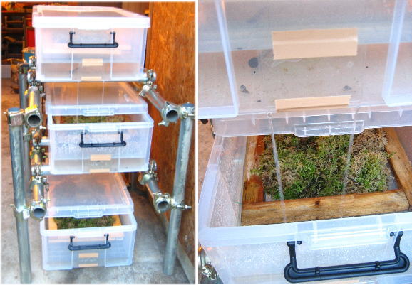 新しく考案した蛍の幼虫飼育装置です。今年は15ペアの蛍から卵を採取しました。1ケースごとに5ペア分の蛍から生まれた幼虫がスクスクと成長を続けています。この飼育装置は階段状に並んでおり、正面に小さな穴を開けています。そのため、上のケースに水を流し込むだけで、水が下のケース、さらに下のケースへと流れていき、水替えの手間が一回分で済む楽チンな仕組みになっています。いいでしょ? |