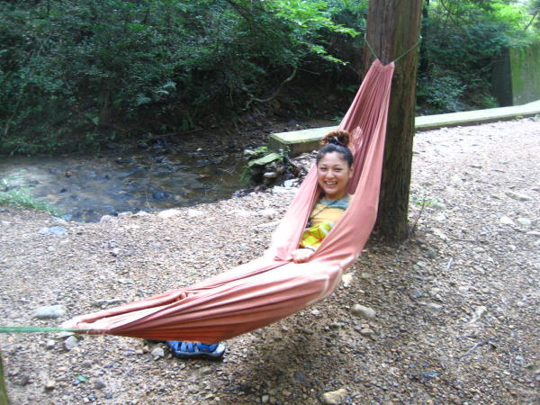 昨年、アルバイトスタッフとしてお手伝いいただいた、なおちゃんが友達を連れて遊びに来てくれました(^-^)しかも、気持ち良さげなハンモック持参☆こもれびサイトにて、チマキ状態で揺られていました♪ |