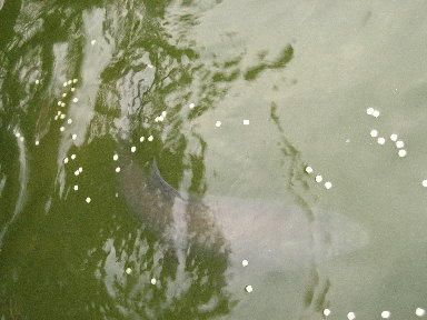 ソウギョ池のソウギョです。エサを食べに来たところをパチリしました。ソウギョは色が地味なので池の底の方にいるとあまり目立ちませんが、エサをやる時に水面に上がってくるとその大きさに驚きます。もっともっと大きくして、犬キャンの名物になる日が楽しみです。現在一番大きいもので60cm程です。 |