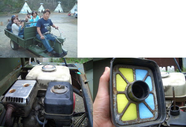 オイル交換とエアフィルター交換、フィルターはなんと食器を洗うスポンジです!1983年1月25日にホンダから発売されたGX140というエンジン現在も絶好調です!犬キャンで働く珍車→http://www.kirakira.net/car/