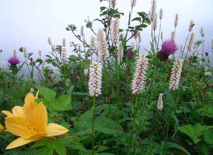 こんばんは! 昨日の夕方から降り出した雨は今日になって本格的に降り一日中雨でした。 三周ヶ岳レポート(つづき) 黄色い花はニッコウキスゲ(日光黄菅)、ゼンテイカ(禅庭花)ともいわれています。黄色いので遠くからでも目立ちますね。 ピンク色のがアザミです。 白いのは・・・名前忘れました・・・せっかくおじさんに聞いたのに・・・てな感じです。