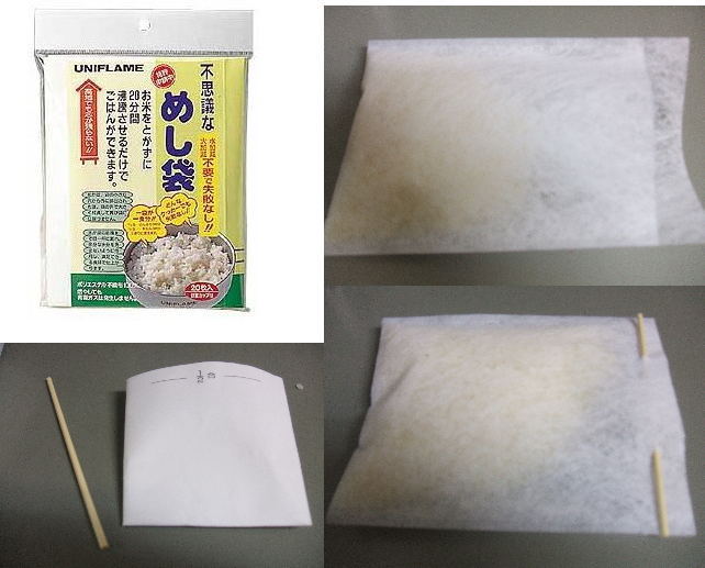 こんばんは。 今日はアウトドアで便利な食のグッツをご紹介します。 ユニフレームから発売されている「不思議なめし袋」です。 なんと火加減、水加減不要!20分間クッカーでぐつぐつするだけでごはんができてしまいます。←出発前に画像右下のように専用の袋に生米を入れ串をさして封をします。 アウトドアでもやっぱりご飯がほしい!方はぜひお試しください。 とても便利です。http://www.uside.net/cooking/meshi/ |