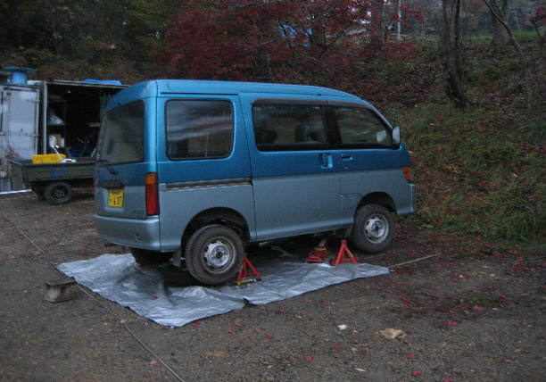 一昨日からいっきに寒くなりました。 日本各地では初雪が観測され例年より早く積雪も多いそうです。 犬山キャンプ場では曇っていて気温も上昇しませんでした。 そんな中、犬キャン業務車を修理していました。ダイハツハイゼットアトレーです。