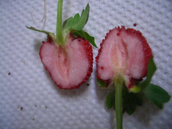今日は雨が降ったり止んだりの繰り返しでした。 5月25日に紹介した実の正体は依然不明です。 半分に切ってみました・・・ほんとにイチゴみたいですね〜。