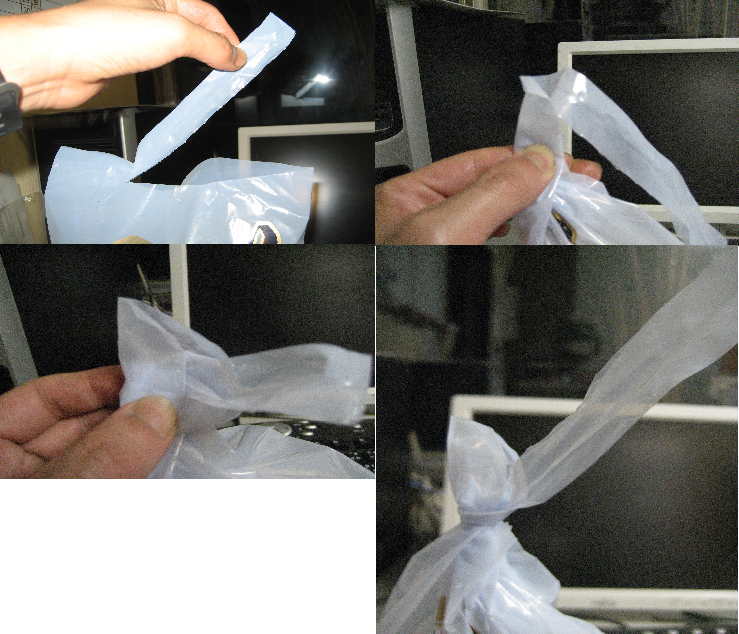 こんばんは。 今日はエコテクニックの紹介です。 アウトドアでもご家庭でも簡単にできます! 袋の口の閉じ方 画像左上@開封するとき 画像右上A開封口を小さく折りたたみます 画像左下B@で切り残したところで結びます。 画像右下C完成!