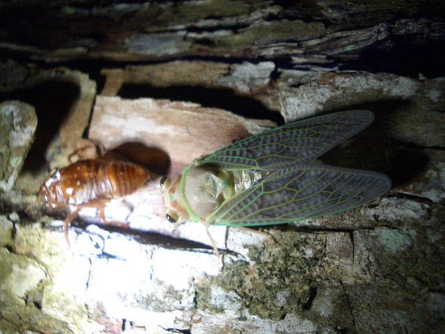 こんばんは、今夜もセミがみんみんいってます。 数年前にキャンプした時に撮影しました、脱皮直後のセミです。 地面から突如出現しゆっくりと木に登って2mくらいで止まりました1時間ほどで脱皮がはじまり完了まで2時間くらいだったかな・・・夜が明け前にはよくみるセミの色に変わって飛んで行きました。 |