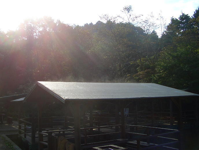今日の朝模様 朝露で水上デッキの屋根が濡れ朝一番の日差しが差し込んできたところ。 |