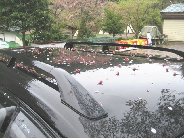 さて、今日の一枚は! これはケッチの車です。 注目なのは車の上に乗っている花です。 今回の雨で・・・ 桜が落ちまくり!! でも遠めで見ると花を飾っている様にも見えて、最後まで綺麗な桜なのでしたヽ(´ロ`) |