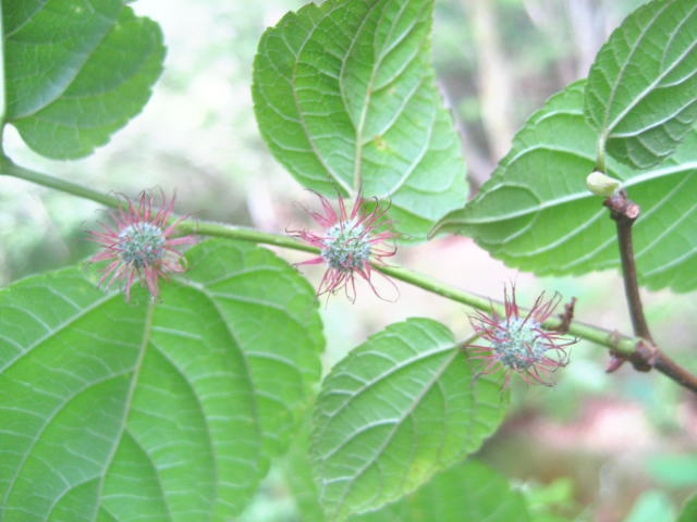 では、今日の一枚。 コウゾです。 これ紙の原料にもなるし、実は甘いんですよ。 実が出来たらこっそり食べよう</B>なんて考えてませんよ?? |